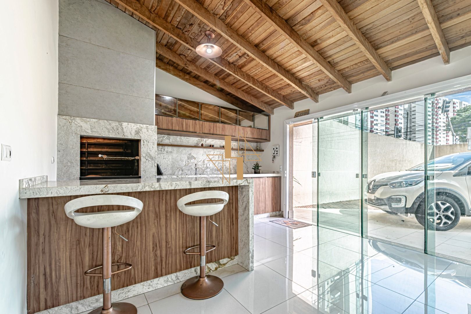 Espaço gourmet espaçoso, pé direito alto em madeira, pensado com carinho para receber família e amigos.